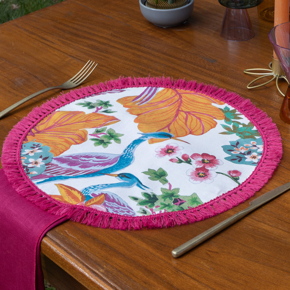 Tovaglietta Whisper Base bianca confantasia floreale, aironi tropicali e dettagli vivaci, frangia fuscia su bordo. Misura diam 33 cm Fa parte della linea Coordinati ” Whisper” di cui trovate ombrellone e cuscini